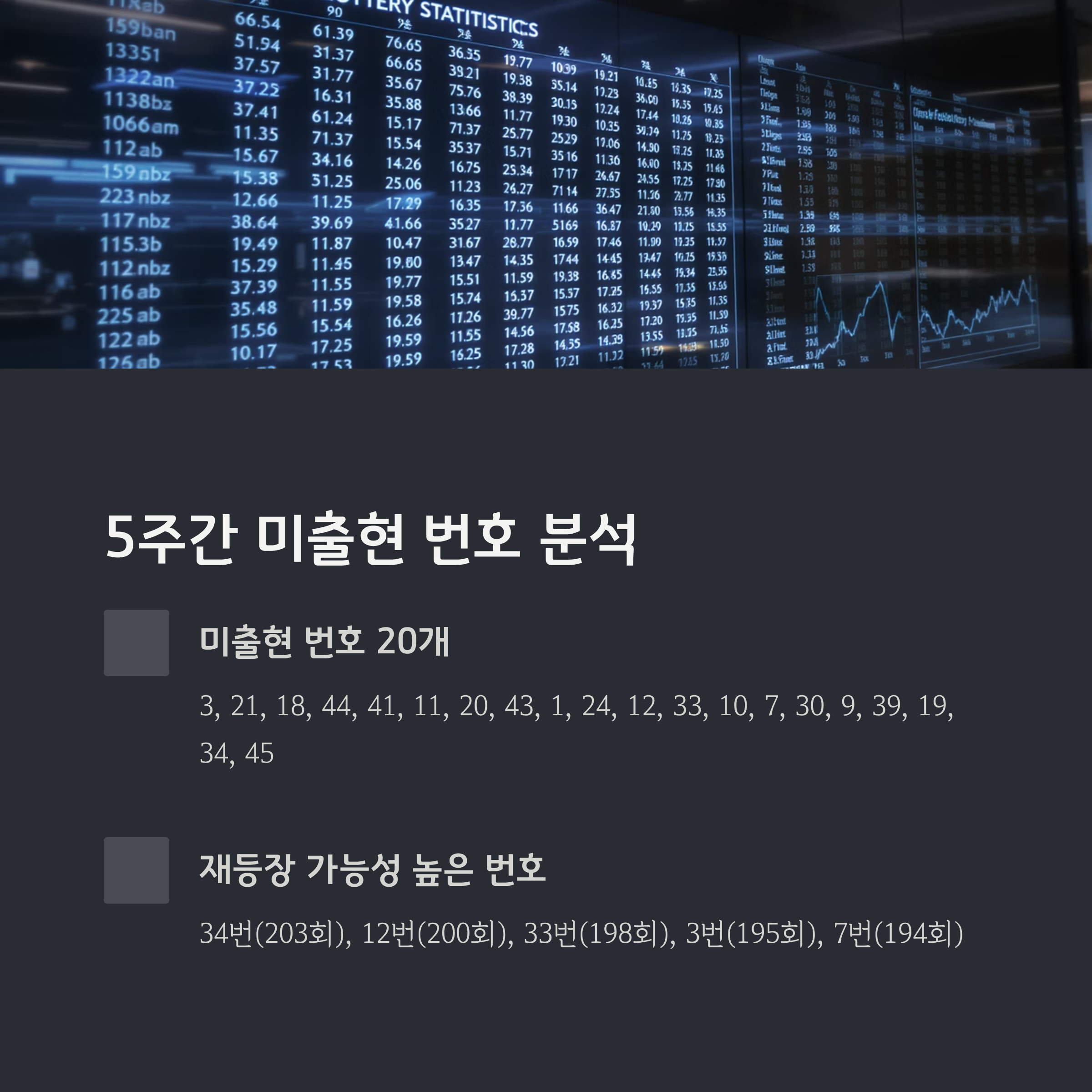 1187회 기준으로 최근 5주간 미출현 번호는 총 20개에 달합니다. 3, 21, 18, 44, 41, 11, 20, 43, 1, 24, 12, 33, 10, 7, 30, 9, 39, 19, 34, 45가 해당 번호들입니다.