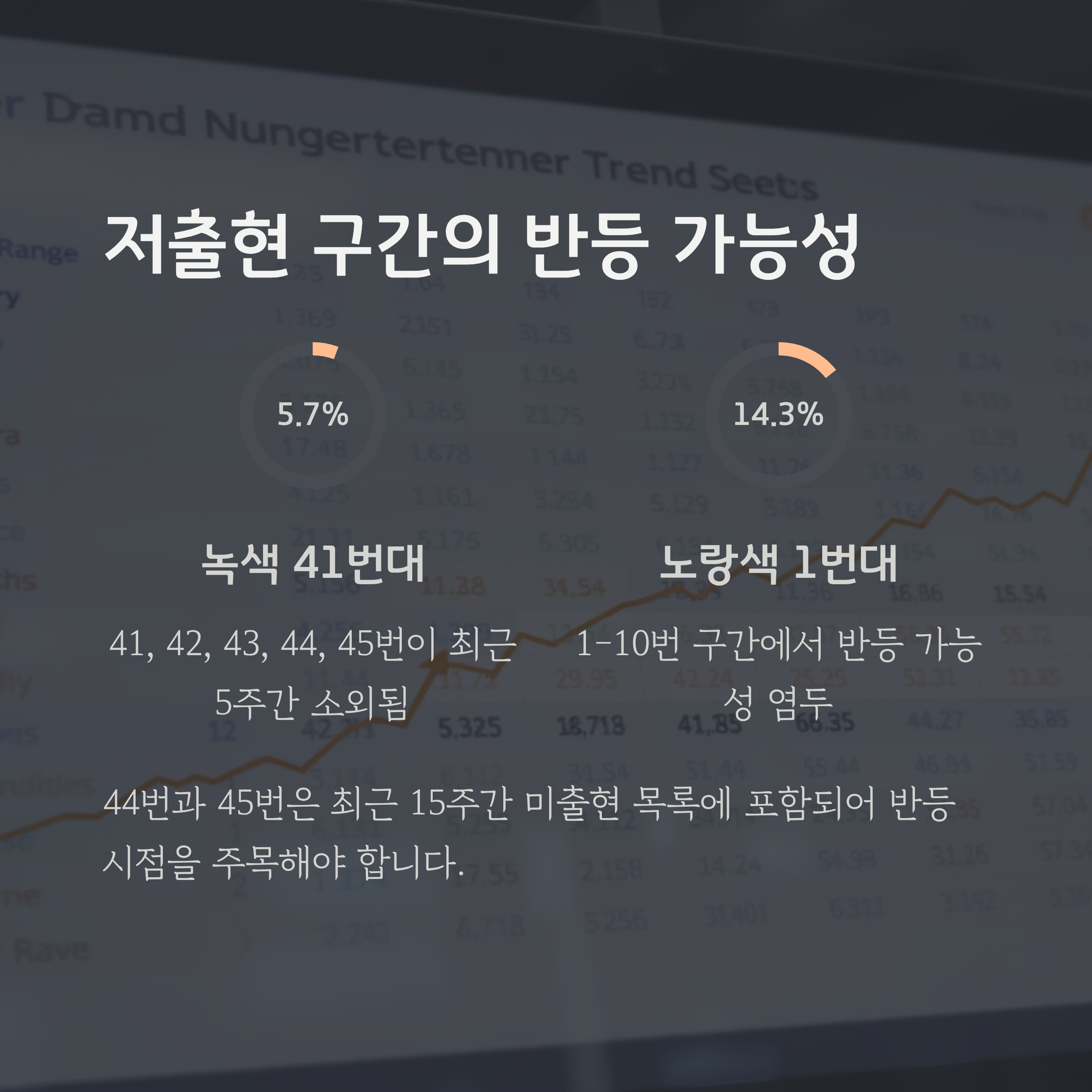 앱의 '번호 미출현 통계'에서 최근 5주 기간을 조회하면 이 구간의 미출현 현황을 정확히 파악할 수 있습니다. 특히 44번과 45번은 최근 15주간 미출현 목록에 포함되어 있어 반등 시점을 주목해야 합니다.