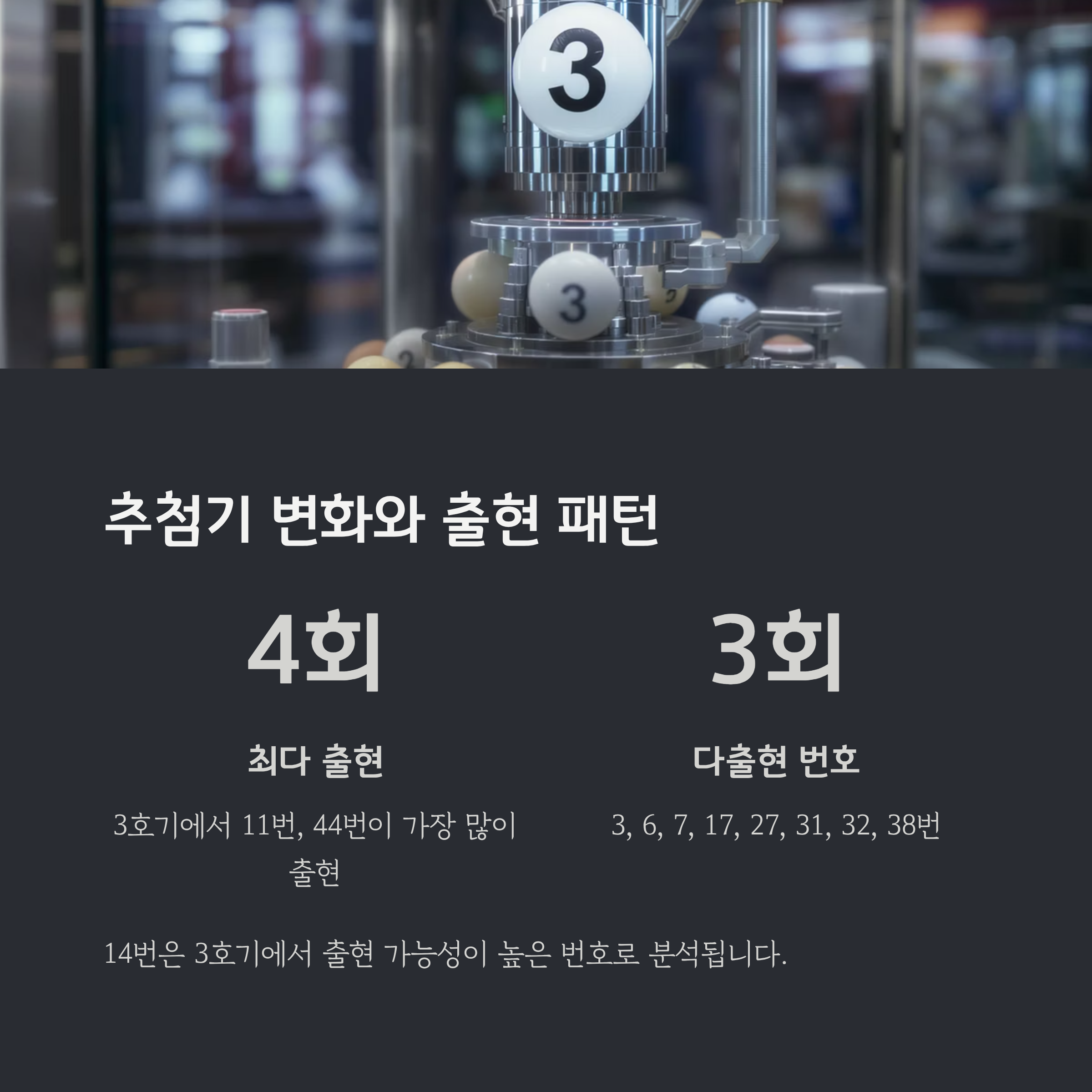 특히 주목할 점은 최근 15회차까지 3호기에서 미출현인 14번과 26번이었는데, 26번은 1187회 2호기에서 당첨되었습니다. 14번은 여전히 3호기에서 출현 가능성이 높은 번호로 분석되며, 최근 10회차까지 3호기에서 미출현인 26번과 28번도 주목해야 합니다.