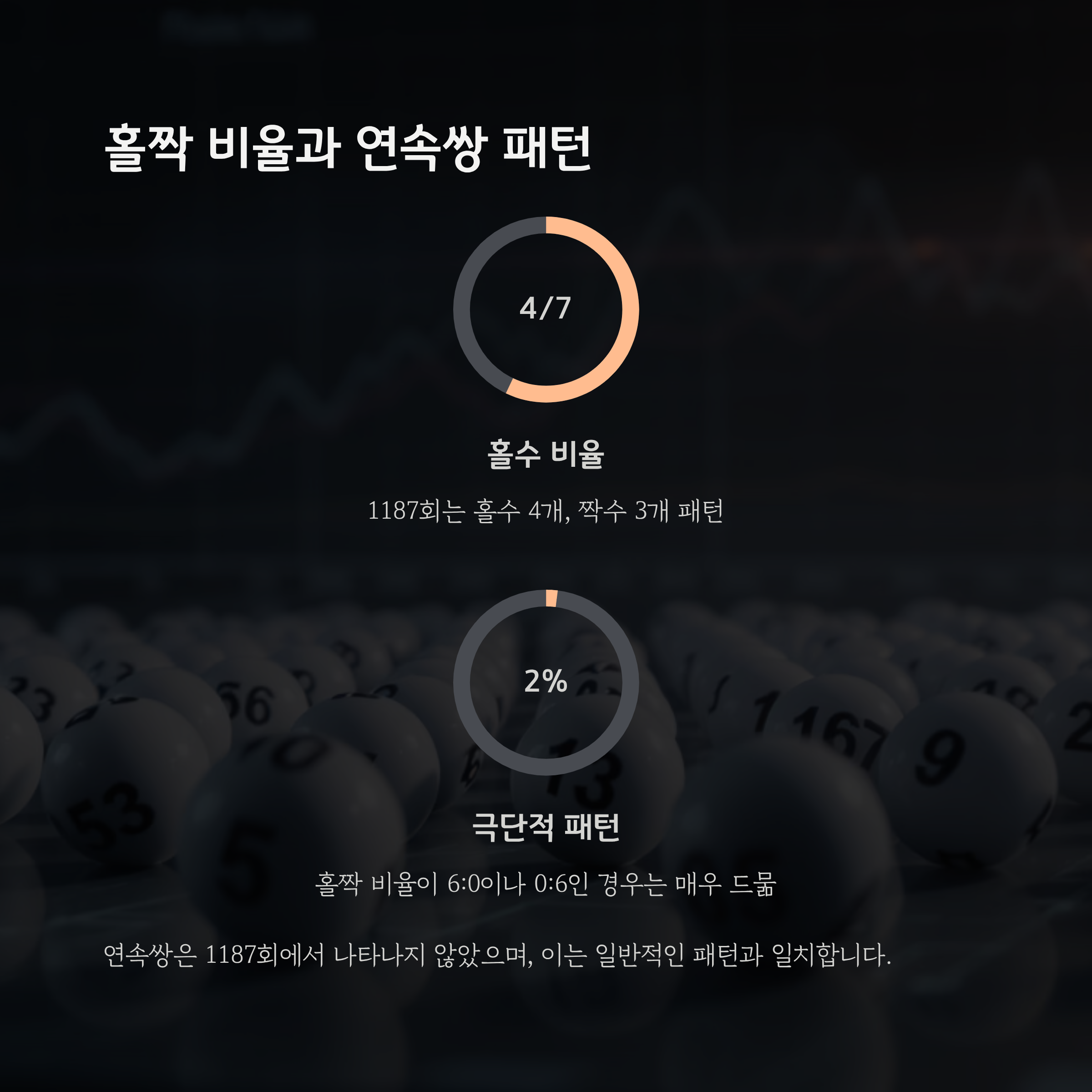 1188회 예상에서는 1187회의 홀수 우세 패턴을 고려하여 홀수 3-4개, 짝수 2-3개 정도의 균형잡힌 비율을 목표로 설정하는 것이 적절해 보입니다.