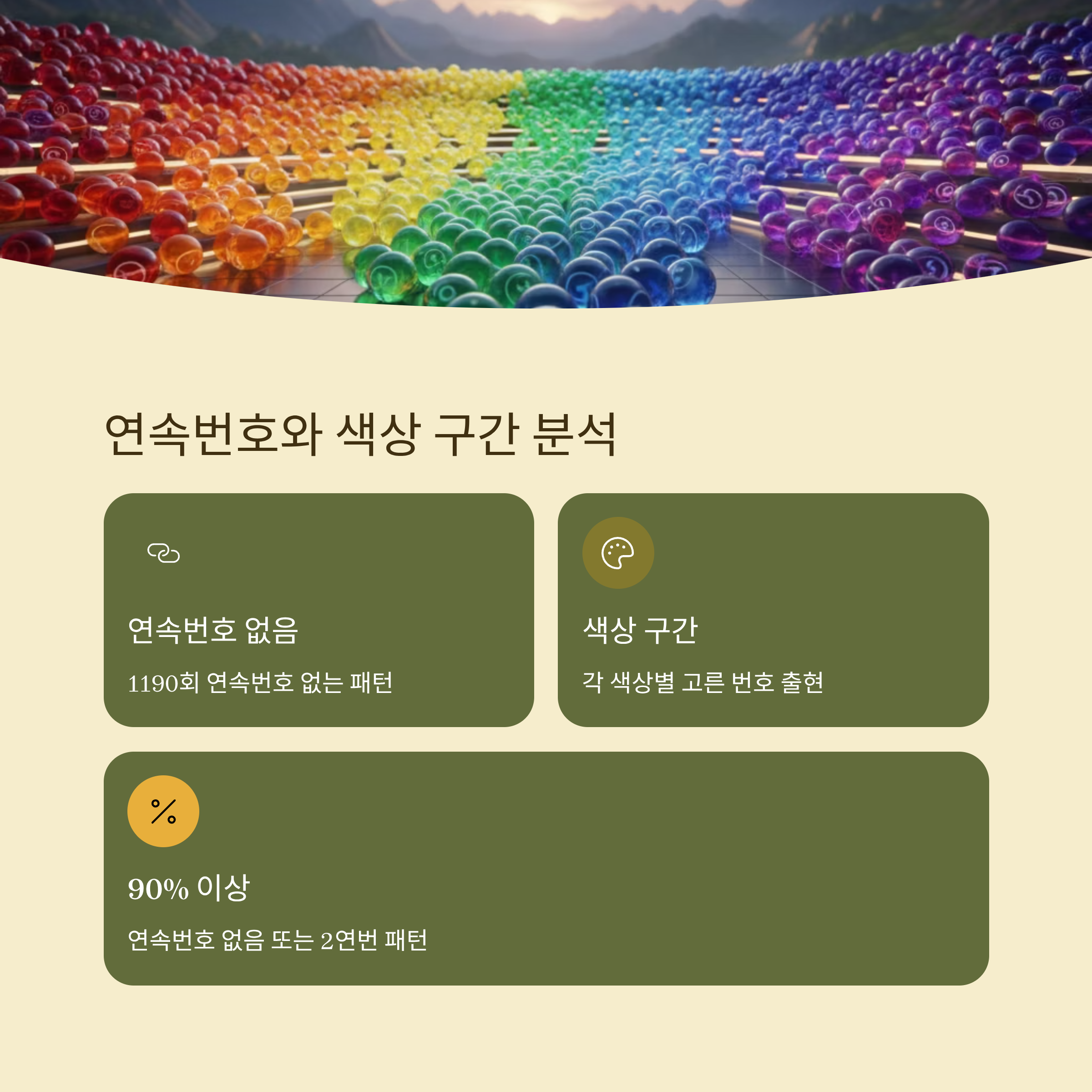1190회 당첨번호에서는 연속번호가 없었습니다. 역대 통계를 보면 연속번호가 없거나 2연번이 나오는 경우가 90% 이상을 차지합니다. 따라서 1191회에서도 연속번호 없음 또는 2연번 패턴을 고려해야 합니다.