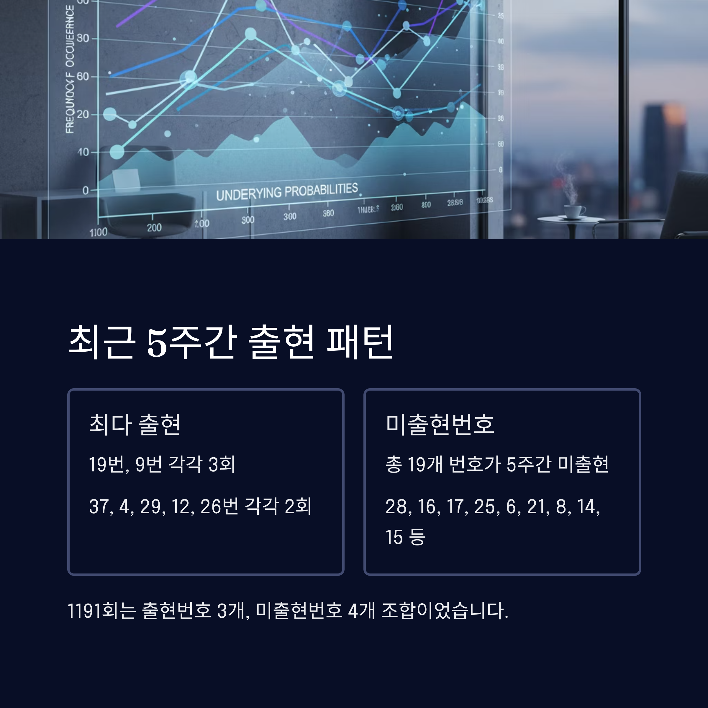 28번은 최근 5주간 미출현번호이지만 최근 10주간 3회 출현하여 곧 다시 나올 주기가 되었습니다. 31번은 최근 10주간 4회 출현하여 높은 빈도를 보이고 있으며 10월 통계에서도 20회로 상위권입니다. 41번은 1191회 당첨번호였지만 이월수로 다시 선택될 가능성도 있습니다.