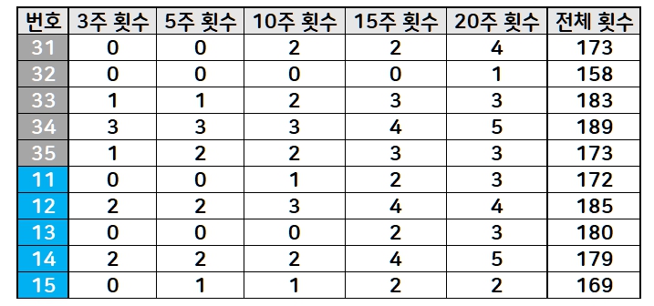 번호대 흐름표를 분석하면 31 ~ 35번대, 11 ~ 15번대 로또번호들이 가장 많이 나오고 있습니다. 1098회 고정수로 사용하기 좋은 번호대입니다.