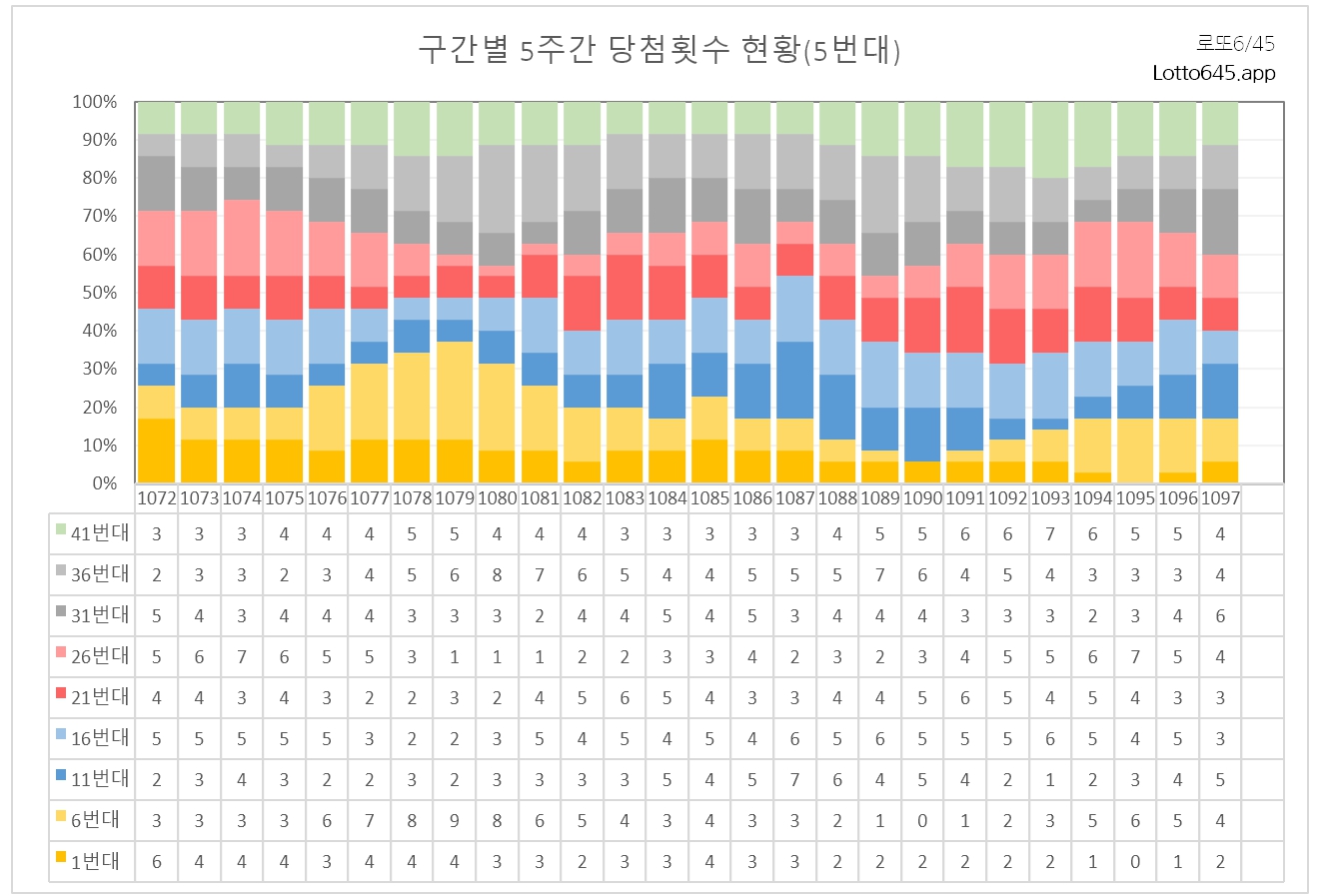 21 ~ 25번대, 16 ~ 20번대는 하락세로 1098회 제외수로 사용하면 좋을 번호대입니다.