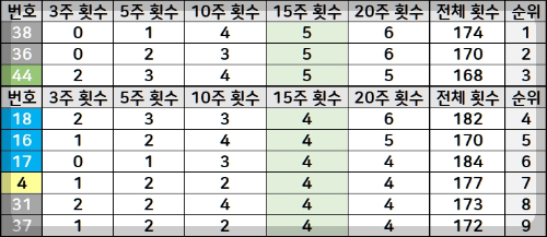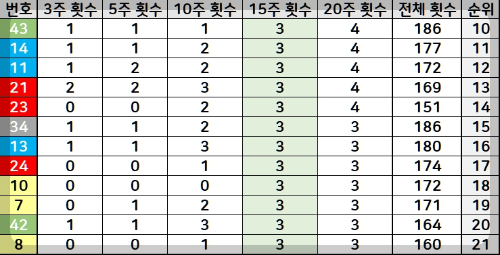 15주 당첨 횟수로 분석한 자료에서는 3회 2회 당첨된 번호들도 중요한 가중치를 갖고 있습니다.