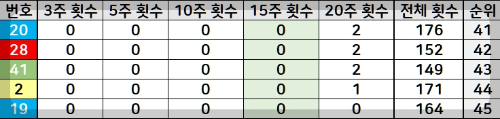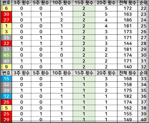 로또 당첨 번호 45개를 15주 기간으로 분석하여 15주 당첨 횟수가 가장 많이 나온 순서로 표를 작성했습니다.