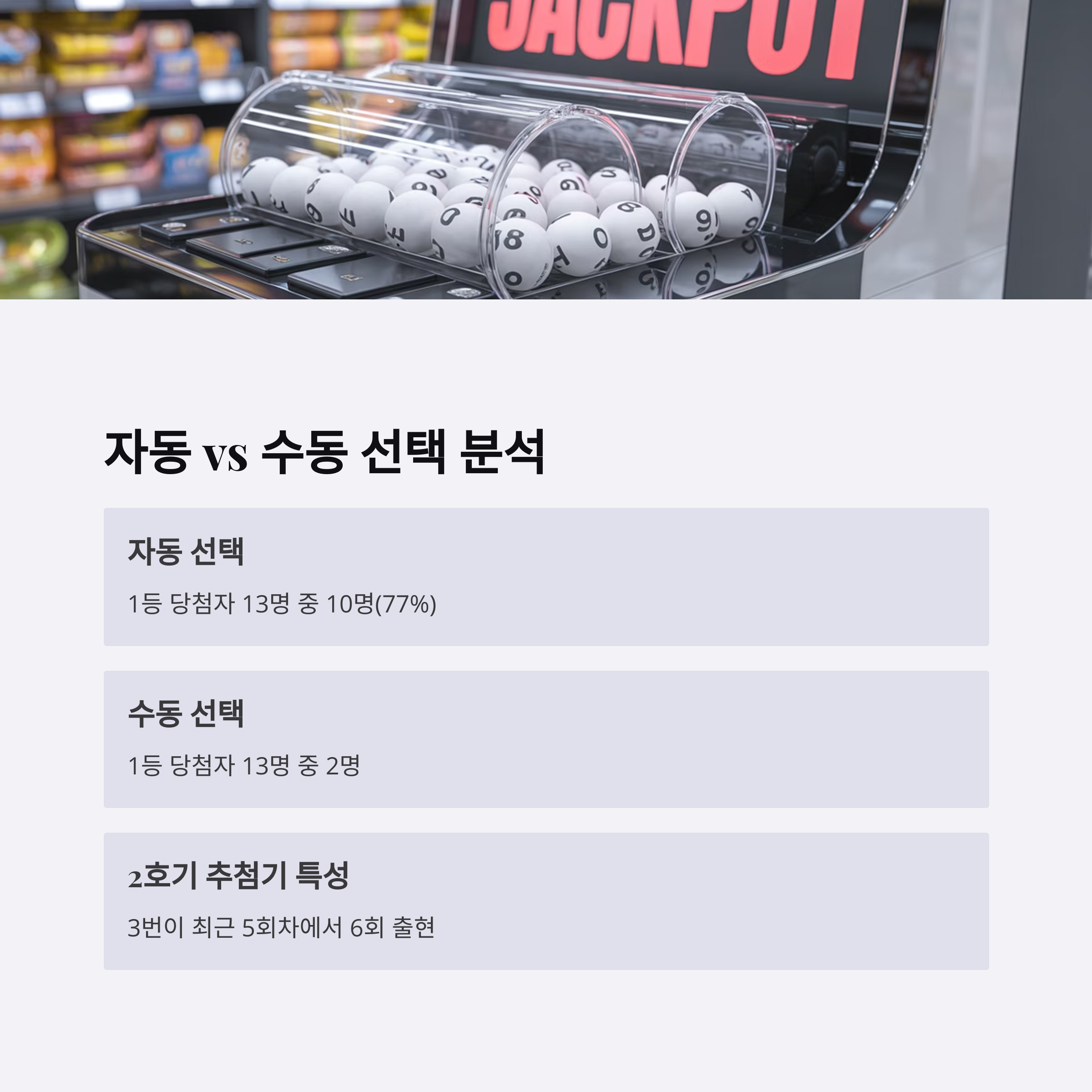 1172회 1등 당첨자 13명 중 자동 선택이 10명으로 77%를 차지했지만, 수동 선택도 2명이나 나왔어요. 이는 개인의 번호 선택 전략이 여전히 유효함을 보여주는 지표죠.