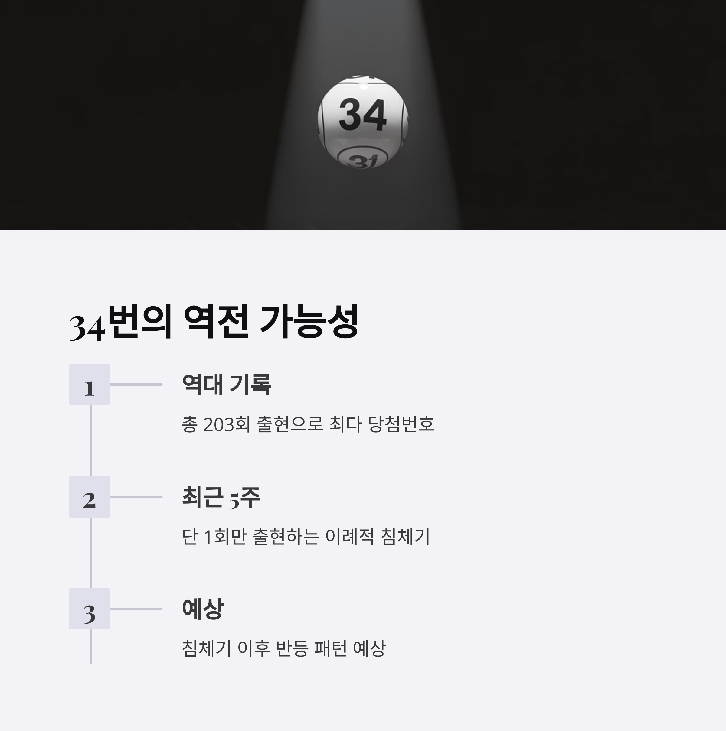 로또분석 당첨번호 앱을 활용해 분석한 결과, 역대 최다 당첨번호 34번(203회)이 최근 5주간 단 1회만 출현하며 역전 신호를 보내고 있어요.