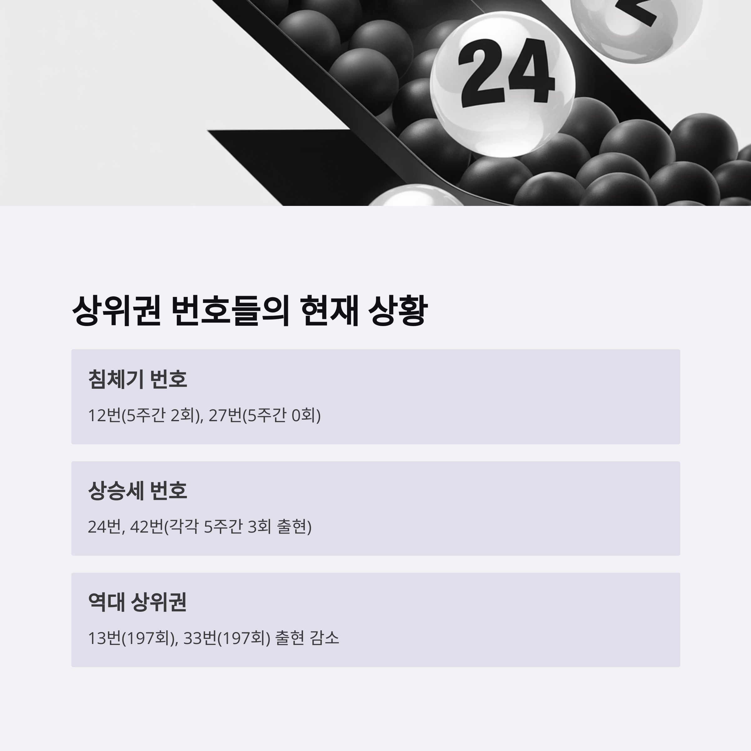 12번(199회), 27번(198회), 13번(197회), 33번(197회) 등 역대 상위권 번호들도 최근 들어 출현 빈도가 줄어들고 있어요. 12번은 최근 5주간 2회, 27번은 0회로 미출현 상태죠.