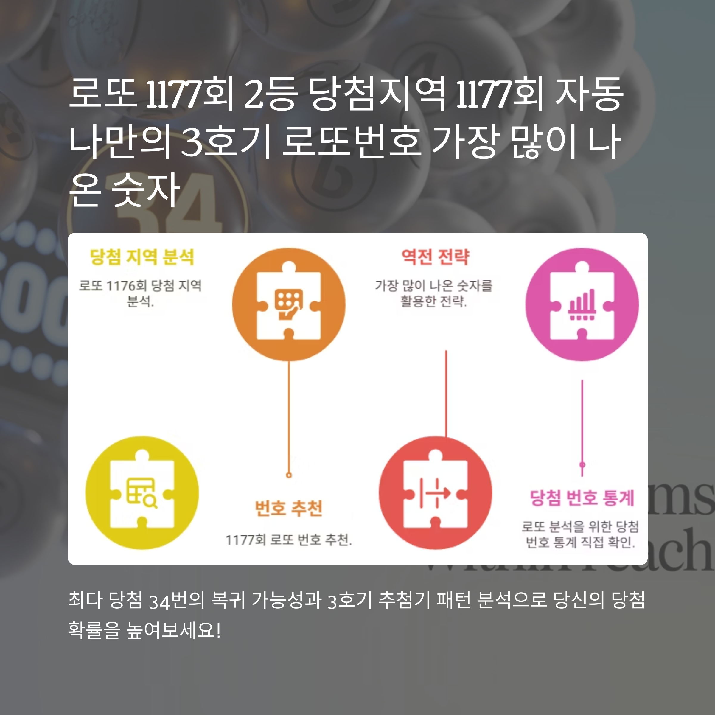 로또 1176회 2등 당첨 지역 분석 결과 경기도 18명을 비롯해 전국 89명의 2등 당첨자가 배출되면서 높은 관심을 받고 있습니다. 1177회 로또 자동 나만의 로또번호 추천을 위해서는 3호기 추첨기의 특성과 최근 출현 패턴을 면밀히 분석해야 합니다. 특히 역전 전략으로 가장 많이 나온 숫자 34번(203회)이 최근 5주간 미출현 상태를 보이고 있어 복귀 가능성이 주목받고 있습니다.