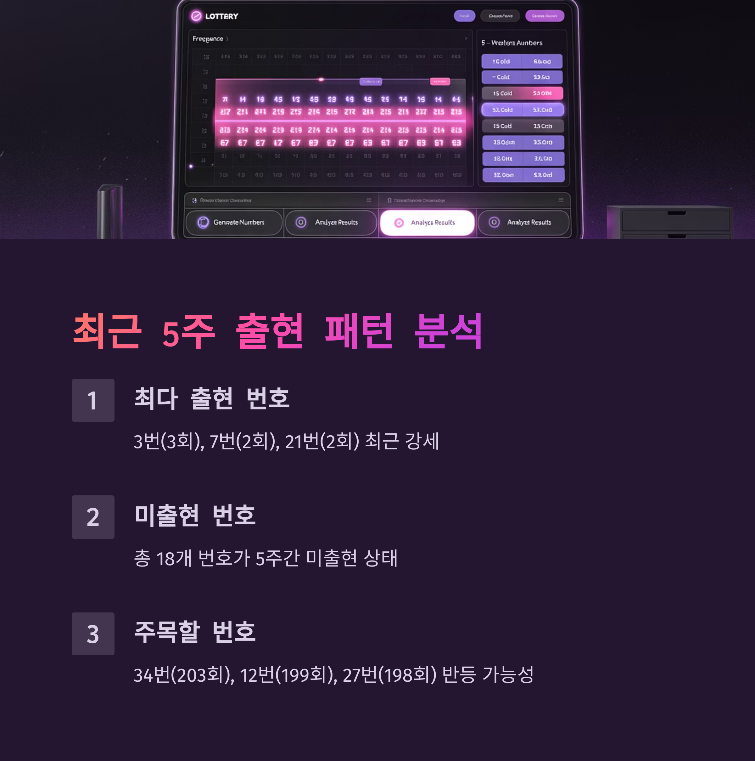 7번은 최근 5주간 2회 출현하며 꾸준한 강세를 보이고 있고, 3호기에서도 높은 출현 빈도를 기록하고 있습니다. 12번과 27번은 역대 상위권 당첨번호임에도 최근 미출현 상태로 반등 가능성이 높습니다.