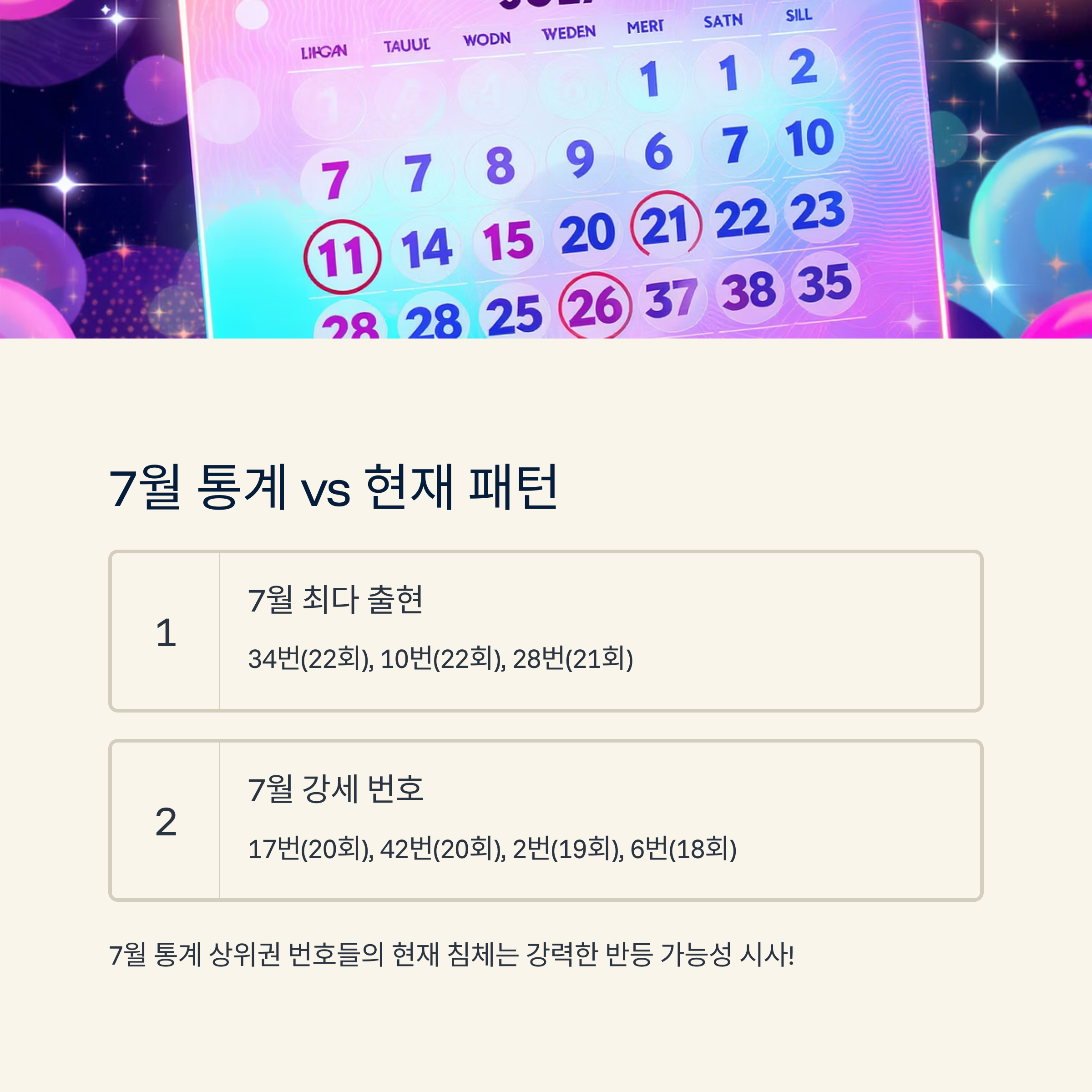 7월 역대 누적 통계를 보면 34번이 22회, 10번이 22회, 28번이 21회로 최상위권을 형성한다.